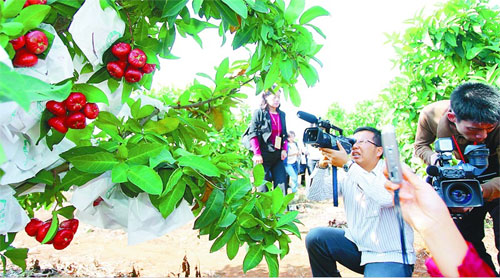 11月29日,在海口市臺資企業(yè)金德豐蓮霧基地,兩岸新聞媒體記者紛紛拍攝蓮霧果。( 海南日報(bào) 李英挺 攝)