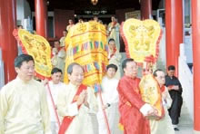 媽祖靈身在8位師父進(jìn)行誦經(jīng)和灑凈儀式后,由主祭在其他陪祭和儀仗隊(duì)陪同下,移駕至主要祭拜處,供善信祭拜。