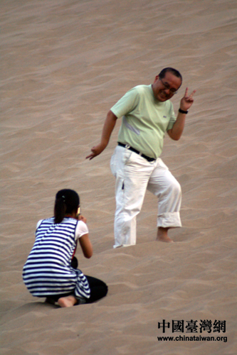 臺灣記者康彰榮在鳴沙山拍照留影。(中國臺灣網(wǎng) 郜利敏 攝)