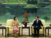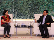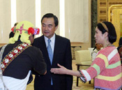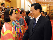 中共中央總書記胡錦濤19日下午在人民大會堂會見了高金素梅率領(lǐng)的臺灣少數(shù)民族代表團全體成員,并發(fā)表了即席講話。