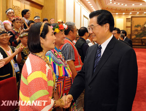 8月19日,中共中央總書記胡錦濤在北京人民大會堂會見高金素梅率領(lǐng)的臺灣少數(shù)民族代表團。新華社記者李學(xué)仁攝