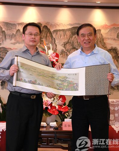 浙江省委副書記、省長呂祖善向臺灣媒體聯(lián)合采訪團(tuán)贈送禮品
