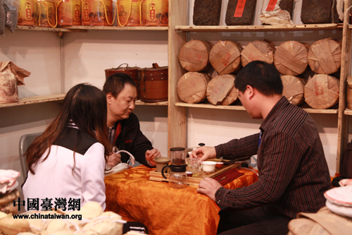 幾位市民正在享用云南普洱茶。(中國臺灣網 肖燕 攝)