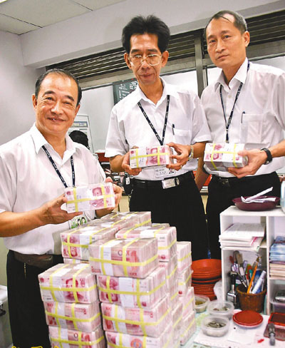 臺灣土地銀行金門分行展示人民幣現(xiàn)鈔(資料圖片)