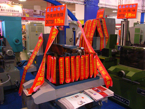 在本屆臺交會上,許多參展商都獲得了大量訂單,高興之余,有的展商還將成果貼在展品上。(圖為離大會閉幕還有一天,參展商富信成五金機械有限公司就已在帶來的一款機床上貼滿了訂單條)