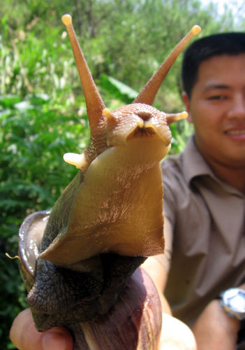 2006年8月26日晚,福州農(nóng)大學(xué)生小廖在回宿舍的路上,發(fā)現(xiàn)一只長(zhǎng)達(dá)17厘米,重約300克的巨型蝸牛。后來小廖因?yàn)楹闷姘堰@只大家伙帶回宿舍過了一夜。
