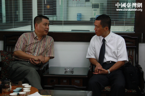 知名講師鄭琳鋒與飛鴻五金飾品有限公司總經理陳建明進行內訓前交流。(中國臺灣網 胡珊珊 攝)