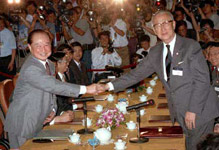 29日上午10點(diǎn)52分,汪道涵、辜振甫分別代表海協(xié)和海基會(huì)在《汪辜會(huì)談共同協(xié)議》等四項(xiàng)協(xié)議上,鄭重地簽署了自己的名字。對(duì)此,辜老先生感慨地表示,“今天上午簽署的協(xié)議,為兩岸事務(wù)性交流掀開了新的一頁(yè)”,“使兩岸關(guān)系跨出了歷史性的一步”,“為兩岸未來的發(fā)展打下了良好的基礎(chǔ)”,“對(duì)發(fā)展兩岸關(guān)系、兩岸交流秩序化將是一座里程碑”。