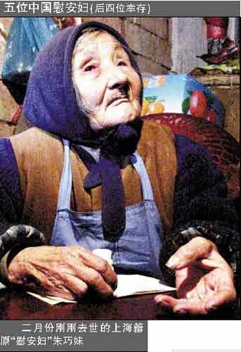 2005年2月20日,96歲的朱巧妹在孤苦中辭世。此前她是上海市崇明廟鎮慰安婦幸存者,也是世界上最年長的慰安婦幸存者。隨著她的離世,公開承認的中國慰安婦幸存者只剩下35人。