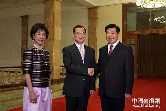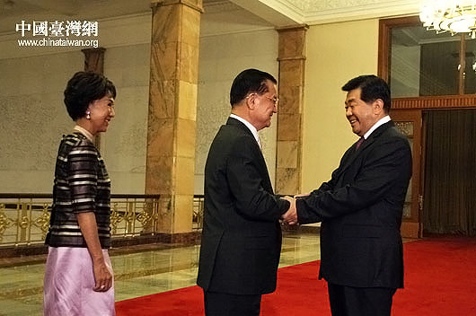 7月27日下午,中共中央政治局常委、全國政協(xié)主席賈慶林在北京人民大會堂北京廳會見了來訪的中國國民黨榮譽(yù)主席連戰(zhàn)一行。(中國臺灣網(wǎng) 鐘寶華 攝)