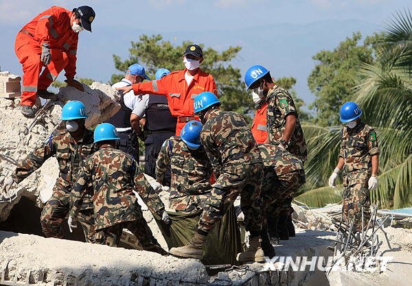 1月15日,在海地首都太子港,聯合國維和士兵搬運尸體。當日,中國國際救援隊在聯合國駐海地穩定特派團大樓廢墟中,挖掘出一具外國人尸體。目前,8名被埋在聯合國駐海地穩定特派團總部大樓的我失蹤人員的具體位置已經基本確定,救援工作正在進行。新華社記者邢廣利攝