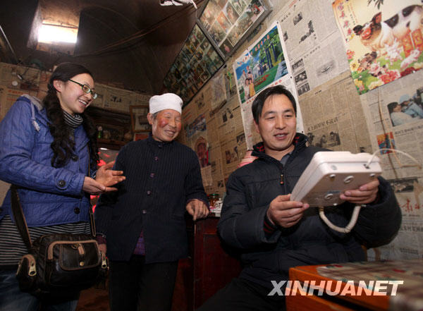 全國(guó)人大代表畢紅珍(左一)和她的丈夫、小學(xué)教師羅老師為安裝無(wú)線座機(jī)的鄉(xiāng)親做售后服務(wù)(2月24日攝)。