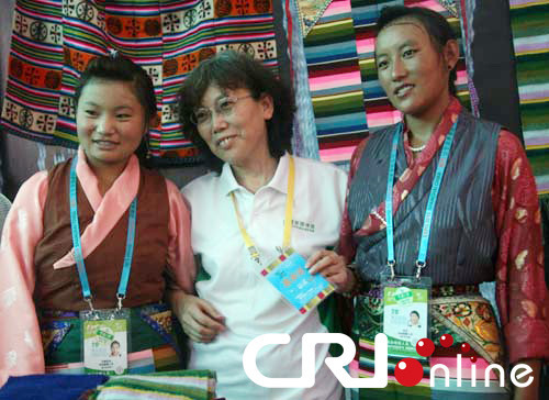 藏族人民常用的毛織圍裙在藏語中稱為“邦典”,西藏山南地區貢嘎縣杰德秀鎮是藏族邦典的主要產地,生產毛織品已有1000多年的歷史,因而有“邦典之鄉”的美稱。目前,西藏山南杰德秀邦典已入選國家級非物質文化遺產名錄。游客與參展人員在“邦典”展柜前合影留念。羅布次仁攝