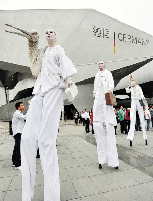 德國館前,德國藝術(shù)家腳踩高蹺前來助興 孫中欽攝