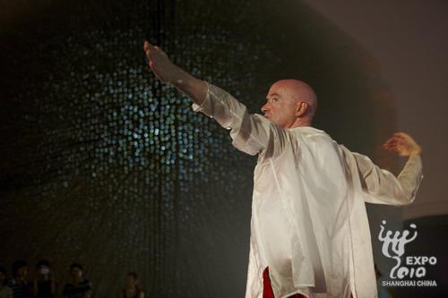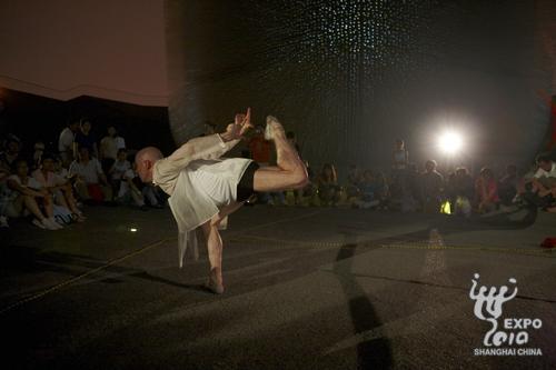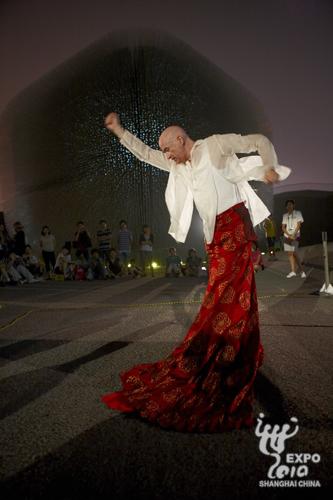 5日晚上,英國藝術(shù)家艾倫·格瑞格(Alan Greig)在“種子圣殿”前展現(xiàn)了精彩絕倫的蘇格蘭現(xiàn)代舞蹈藝術(shù)。艾倫 格瑞格是X Factor舞團的藝術(shù)總監(jiān),他的舞蹈作品集運動、刺激與娛樂性于一體,此次演出片段是根據(jù)他在2009年上海舞蹈節(jié)中首演的獨舞《Into the Light》改編而成。
