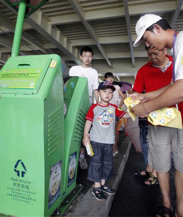一種非常先進的垃圾收集方法——“智能化垃圾氣力輸送系統”已在上海世博園內運行使用。這套高科技系統吞食垃圾的“嘴巴”——51個外觀形似嫩芽的智能化垃圾投放口分布在“一軸四館”范圍內,但尚未被游客廣泛認識。為了讓游客更好地了解和使用,工作人員在園區內進行宣傳和演示,使游客對園區的高科技和環保設施有了更深的了解。