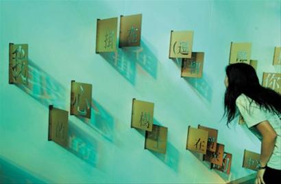 在寶鋼大舞臺傳習區展出的藝術作品《瞬影》,隨著光線的變化,墻上的字能映射出一首詩。(邵劍平 攝)