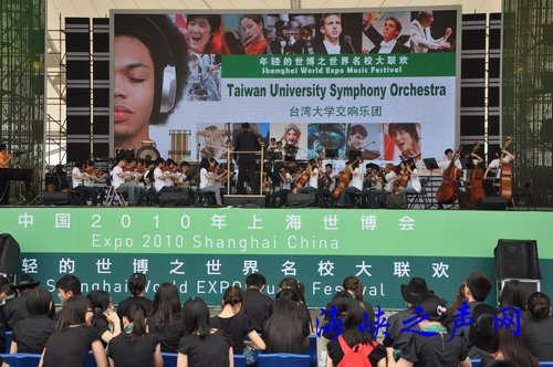 海峽之聲網上海站7月6日電(記者張玉龍)作為中國2010年上海世博會青年周暨世界名校大聯歡開幕式之后的第一場演出,今天上午在世博會浦西園區博覽廣場舉行的“臺灣大學交響樂團”專場演出,因為其作品展現了極具臺灣地方特有傳統文化而格外受到觀眾好評。
