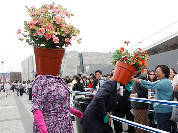 精彩紛呈的世博會,吸引了八方游客前來觀展。穿梭在展館之間的行為藝術表演,也是觀眾不容錯過的節目。更有觀眾自發上陣,支持世博,堪稱一絕。圖為在德國館前,行為藝術表演者吸引眾多觀眾駐足觀賞。(記者:劉歆?攝)