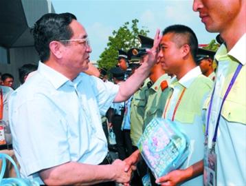 烈日下,俞正聲為世博園區服務保障人員拭去額頭的汗水。(新聞晨報現場圖片)