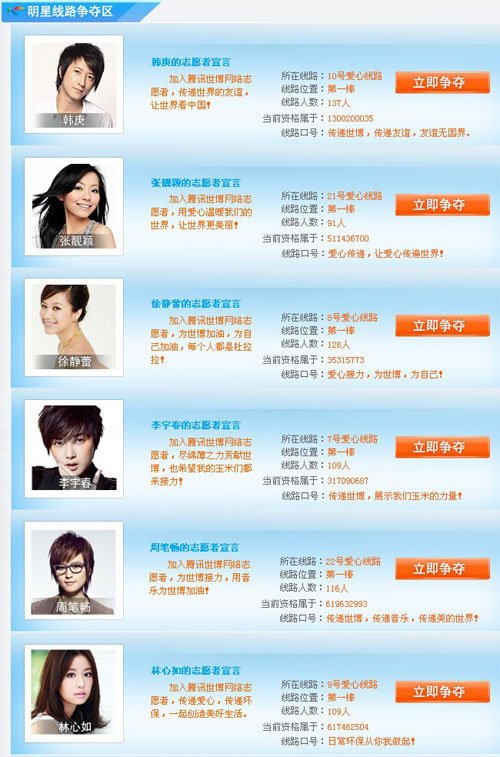 而如今,韓庚、張靚穎、徐靜蕾、李宇春、周筆暢、林心如也和其他明星一道,一起加入世博網絡志愿者接力(http://v2010bmw.qq.com/),履行作為公眾人物的楷模作用,在公益事業上,身體力行。