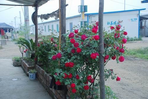 在居民黃大爺家,大媽在屋里做飯,大爺在門前前拾掇花草。一大簇月季開得正艷,旁邊還放著幾盆君子蘭和一些我叫不出名來的花花草草。