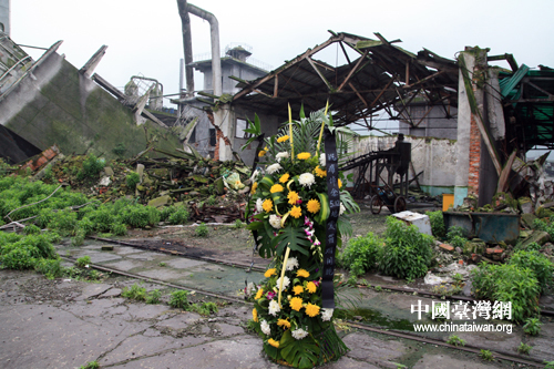 人們在廠區的入口擺上花籃憑吊地震中的罹難者。 (中國臺灣網 田云鵬 攝)