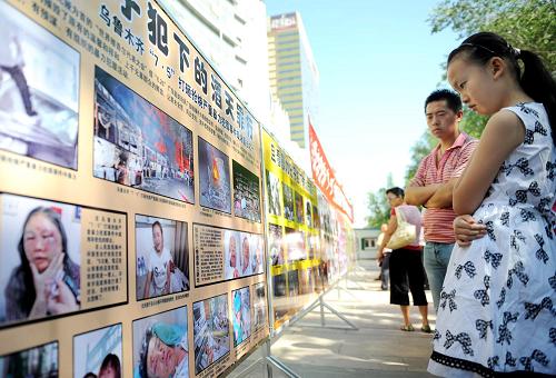7月21日,市民在烏魯木齊市圖書館前觀看圖片展。當(dāng)日,由烏魯木齊市委宣傳部、文化局主辦的新疆維吾爾自治區(qū)烏魯木齊市打砸搶燒嚴(yán)重暴力犯罪事件紀(jì)實(shí)圖片展在烏魯木齊市圖書館前展出,300余幅圖片真實(shí)地再現(xiàn)了烏魯木齊“7·5”事件發(fā)生、處置、善后全過(guò)程。從22日起,該圖片展還將進(jìn)入部隊(duì)、社區(qū)、學(xué)校、鄉(xiāng)鎮(zhèn)等地巡展。新華社記者王菲 攝