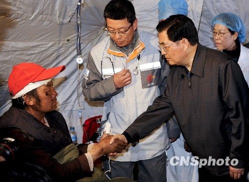 4月18日中午12點10分許,中共中央總書記、國家主席、中央軍委主席胡錦濤先來到青海玉樹地震重災(zāi)區(qū)結(jié)古鎮(zhèn)扎西大同村視察災(zāi)情,慰問災(zāi)區(qū)受災(zāi)民眾以及參加抗震救援的解放軍指戰(zhàn)員、武警、公安等。
