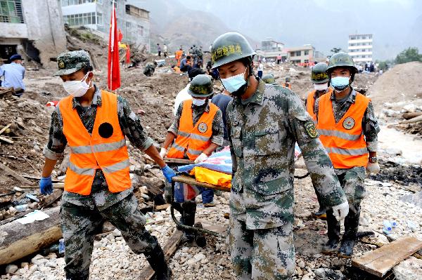 8月13日,救援人員將搜尋到的遇難者遺體抬離現場。根據最新統計數字,截至13日16時,甘肅省甘南藏族自治州舟曲縣特大山洪泥石流災害已造成1156人死亡、588人失蹤。 新華社記者 陶明攝
