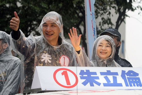 中國國民黨新北市長候選人朱立倫(左)25日與妻子高婉倩(右)在臺北縣板橋市沖刺選情,雖然天空下著雨,仍以車隊掃街拜票方式,爭取選民手中寶貴的1票。 圖片來源:“中央社”