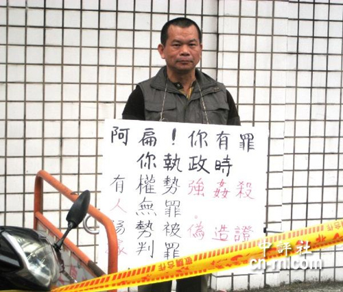 陳水扁委任律師鄭文龍在接受記者訪問時,一位反扁的老伯伯在一旁不停高喊“槍斃陳水扁”,引來警察的注意。警察隨后勸離這位老先生,老先生還從包包里掏出準備好的反扁布條,引起一陣小小的騷動。