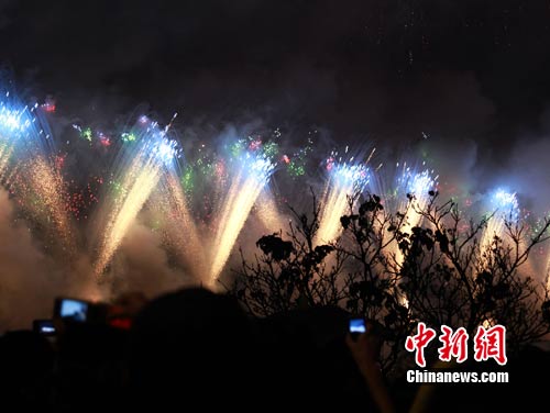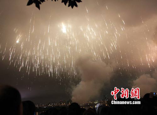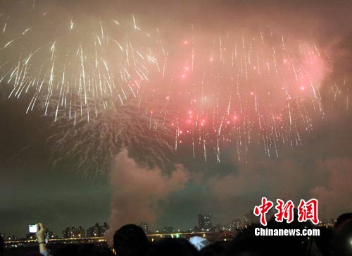 11月6日,臺北花博會今天開幕。主辦單位自晚間9時開始,從大佳河濱公園施放煙火,再一路沿著基隆河、淡水河串連到壓軸的大稻埕碼頭,吸引很多民眾觀看。圖為在大稻埕碼頭施放的煙火。