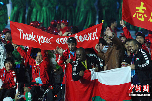 在文藝演出的尾聲,亞殘運會志愿者代表入場,登上了舞臺。亞殘運期間,2.5萬名賽會志愿者和50多萬名城市志愿者用微笑播撒陽光,用真情傳遞溫暖,充分展現了廣州“愛心滿花城”的魅力與形象。在開幕式上歡迎運動員入場的殘疾孩子媽媽們再度登臺,她們為志愿者代表獻上鮮花,感謝志愿者們專業、熱情、周到的服務,使亞殘運會盛開“文明、關愛”之花。