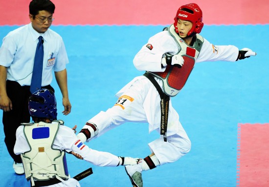 中國臺灣網11月21日廣州消息 在20日舉行的廣州亞運會跆拳道男子58公斤以下級決賽中,中華臺北選手魏辰洋憑借優勢獲勝戰勝泰國選手本益·甲拉革,奪得冠軍。