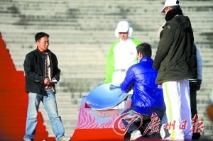 記者看到,兩人不僅拿著采火棒做出半蹲采火的姿勢,新疆少女還緩步獨自走下臺階,重復了多遍類似舉動。記者詢問時,周嘉威托詞自己只是陪同彩排的普通工作人員,不接受采訪。