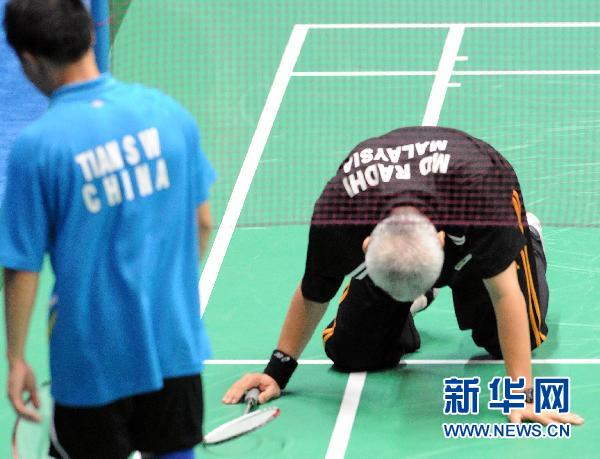 12月14日,在廣州2010亞殘運(yùn)會(huì)羽毛球賽場(chǎng)上,中國(guó)選手田時(shí)偉對(duì)決馬來西亞選手朱哈里的男子單打站立一級(jí)半決賽,就像林丹大戰(zhàn)李宗偉,以精彩絕倫的交鋒展開一場(chǎng)“瑜亮之爭(zhēng)”,又以催人淚下的悲情畫上句號(hào)。當(dāng)中國(guó)羽毛球選手田時(shí)偉丟下拍子、慶祝闖入決賽的喜悅時(shí),他的對(duì)手馬來西亞球員拉迪 朱哈里仰天長(zhǎng)嘆,流下熱淚。得分時(shí)雙拳緊握,為抵抗傷痛不時(shí)揚(yáng)起球拍,朱哈里用自己的方式詮釋了什么叫做“雖敗猶榮”。這是馬來西亞選手拉迪 朱哈里(右)失分后懊悔跪地。 新華社記者王松攝