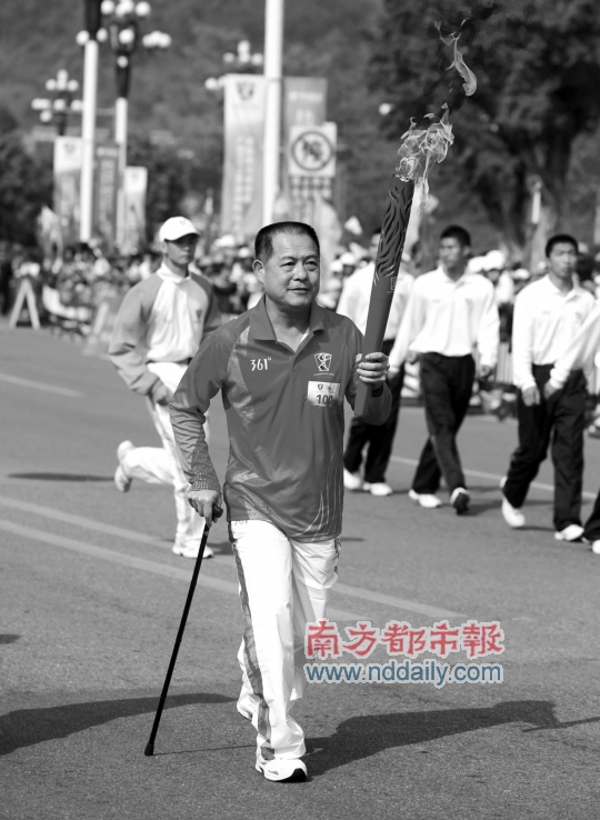 左手拿著火炬、右手拄著拐杖,孫俊明來到了100棒號牌的位置上。異常興奮的他在起跑前舉起火炬讓現場的群眾觸摸。