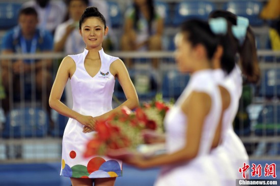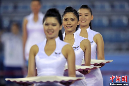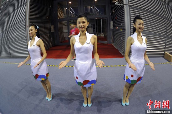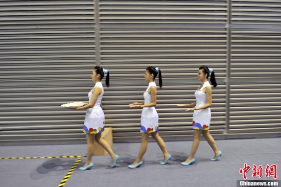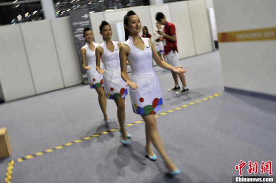 禮儀小姐是深圳大運會頒獎儀式上一道靚麗的風(fēng)景線。圖為8月13日禮儀小姐們在比賽間隙刻苦訓(xùn)練。中新社發(fā) 金碩 攝
