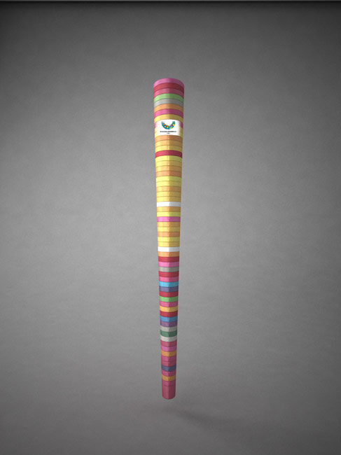火炬的設計靈感來自于深圳大運會會徽“歡樂的U”,以圓點切片為基本元素建構火炬基本形態。每個橢圓形切片以大運會色彩系統為基礎,以紅、黃為主色,體現陽光、青春、圣火的色彩意向;鹁娴膭撘饬咙c在于橢圓形、多彩切片可以任意旋轉出各種造型,是一支可與火炬手互動、造型百變的火炬。每一位火炬手都可以根據自己的想象,調節出自己喜愛的火炬形狀。這就意味著:每一位火炬手和他的火炬都是獨一無二的。 (大運會官網供圖)