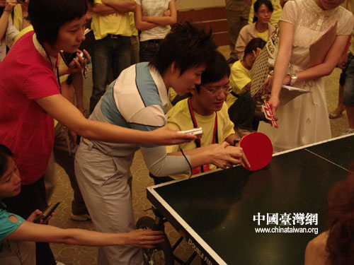 中國臺灣網8月23日北京消息 參加“兩岸青年攜手迎奧運”交流活動的代表們22日上午與三位奧運會冠軍在北京齊聚一堂。兩岸青年與睿智善言的鄧亞萍、詼諧幽默的楊凌、美麗動人的楊揚交流并得以與之切磋球技。(徐唯實)