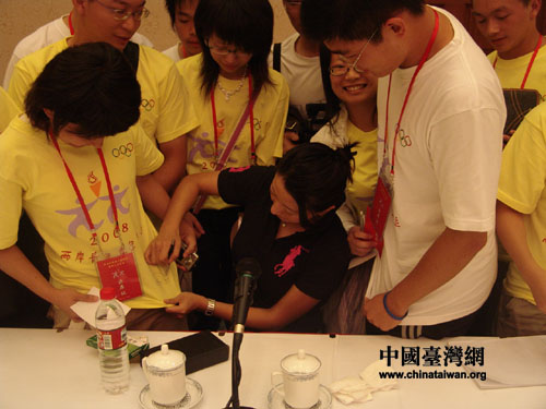 楊揚也忙得不亦樂乎。她的身旁圍了許多爭著照相、索要簽名的青年代表們。“沒想到奧運冠軍會那么漂亮!”,“她不像練體育的啊,更像是拍電影的,怎么看那么像趙雅芝啊!”,這樣的驚嘆不絕于耳。楊揚一一滿足了大家的要求,并在短短的時間內與臺灣青年代表們交上了朋友。。(徐唯實)