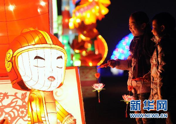 2月15日,孩子們手提荷花燈在南京中華門城墻上看燈展。當(dāng)日是農(nóng)歷正月十三——傳統(tǒng)的“上燈日”。秦淮國際燈會展區(qū)之一的南京中華門舉行提燈迎元宵活動。 新華社記者孫參攝
