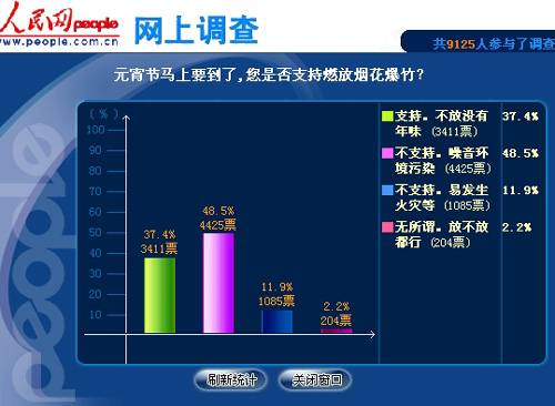 截至14日22時,共有9125人次參與了調(diào)查,選擇“不支持”的網(wǎng)友超過了六成。其中,48.5%的網(wǎng)友(4425票)選擇“不支持。噪音環(huán)境污染”;11.9%的網(wǎng)友(1085票)持“不支持”態(tài)度,是因為“易發(fā)生火災等”。選擇“支持。不放沒有年味”選項的網(wǎng)友只占到了37.4%(3411票)認為。此外,還有2.2%的網(wǎng)友(204票)認為“無所謂。放不放都行”。