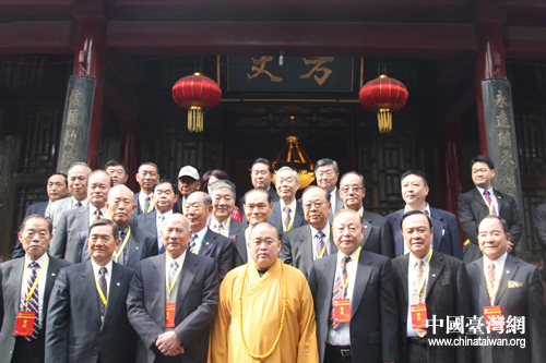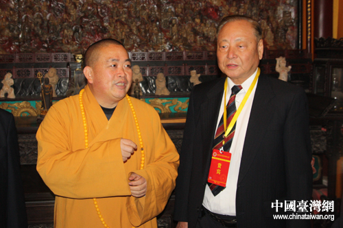 臺(tái)灣退役將領(lǐng)參訪團(tuán)與少林寺方丈釋永信法師合影(中國臺(tái)灣網(wǎng) 趙輝 攝)
