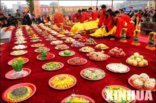 在過去,每年到了除夕夜,許多人家都會擺上一桌天地桌,上面擺滿了祭神用的各種貢品和蠟燭,墻上貼好了要拜的神像。此種習俗傳說中是為了要接神仙下屆而特意準備的。雖然現(xiàn)在這種封建傳統(tǒng)已經(jīng)被破除,但它本身也不失為一種有意思的民俗活動。