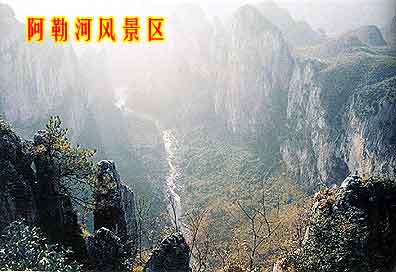 區以大山、大洞著稱,集峽谷、溶洞、河流為一體,面積16平方公里。有2.5公里的峽谷游覽河道,望兩岸石巖上藤蘿密布,矮樹密匝,植被保護良好。阿勒河風景旅游區的開發已列入六盤水市委、市政府2002年十件實事之一,市縣(區)兩級政府已投入100萬元進行景區基礎設施開發建設。