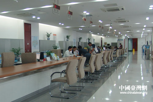 舒適的大廳內(nèi),中心工作人員熱情地為客戶辦理業(yè)務(wù)。(中國臺灣網(wǎng) 李典典 攝)