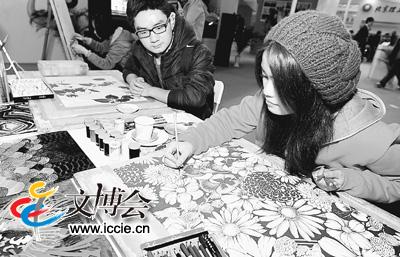 11月21日,在為期4天的第五屆中國北京國際文化創意產業博覽會上,北京服裝學院服裝專業的學生在現場進行印花產品的制作。 本報記者 李維娜攝